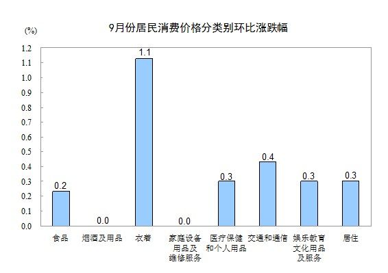 9月份,全國居民消費價格總水平環(huán)比上漲0.3%。其中,城市上漲0.3%,農(nóng)村上漲0.4%;食品價格上漲0.2%,非食品價格上漲0.4%;消費品價格上漲0.4%,服務(wù)項目價格上漲0.3%。